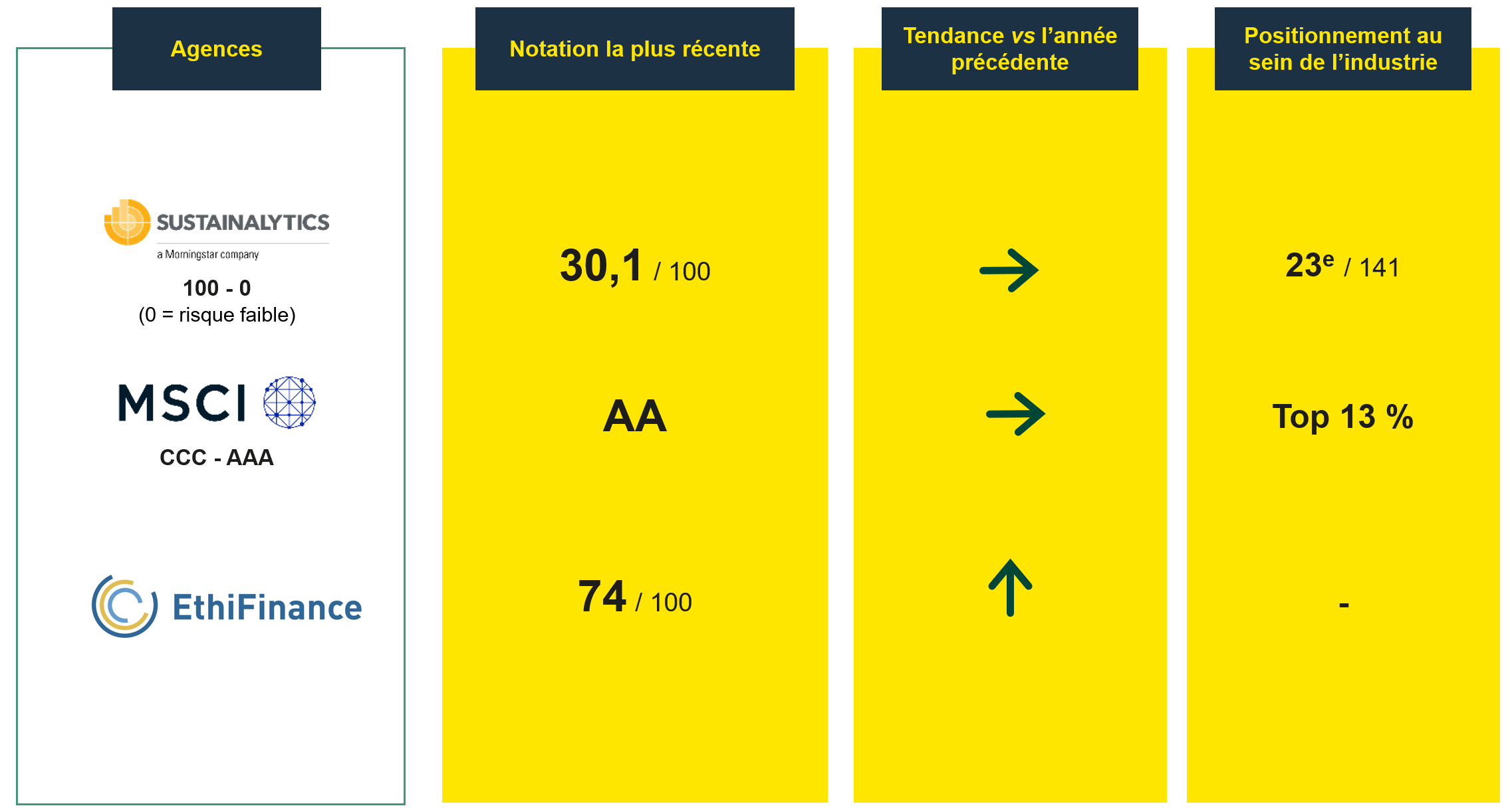 L’amélioration des performances extra-financières du groupe est reconnue par diverses agences de notations extra-financières qui placent Orano dans les meilleurs de sa catégorie.